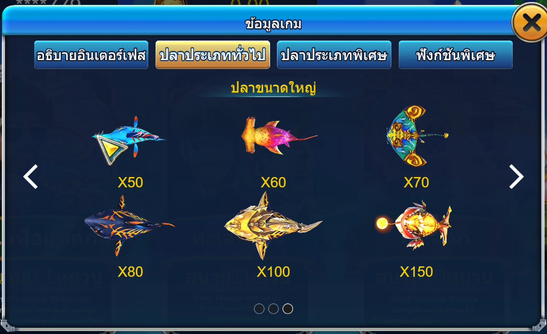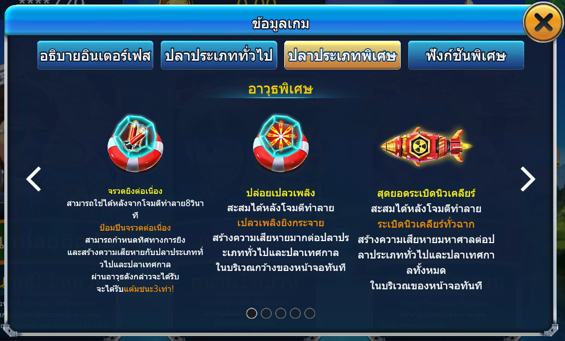 - ปลาพิเศษ เป็นปลาที่ทำให้คุณได้รับปืนพิเศษ อย่างเช่น ปืนจรวด และ ปืนเพลิง หรือได้รับเงินรางวัลที่มากมาย โดยเราสามารถได้รางวัลจากปลาพิเศษถึง 888 เท่ากันเลยทีเดียว