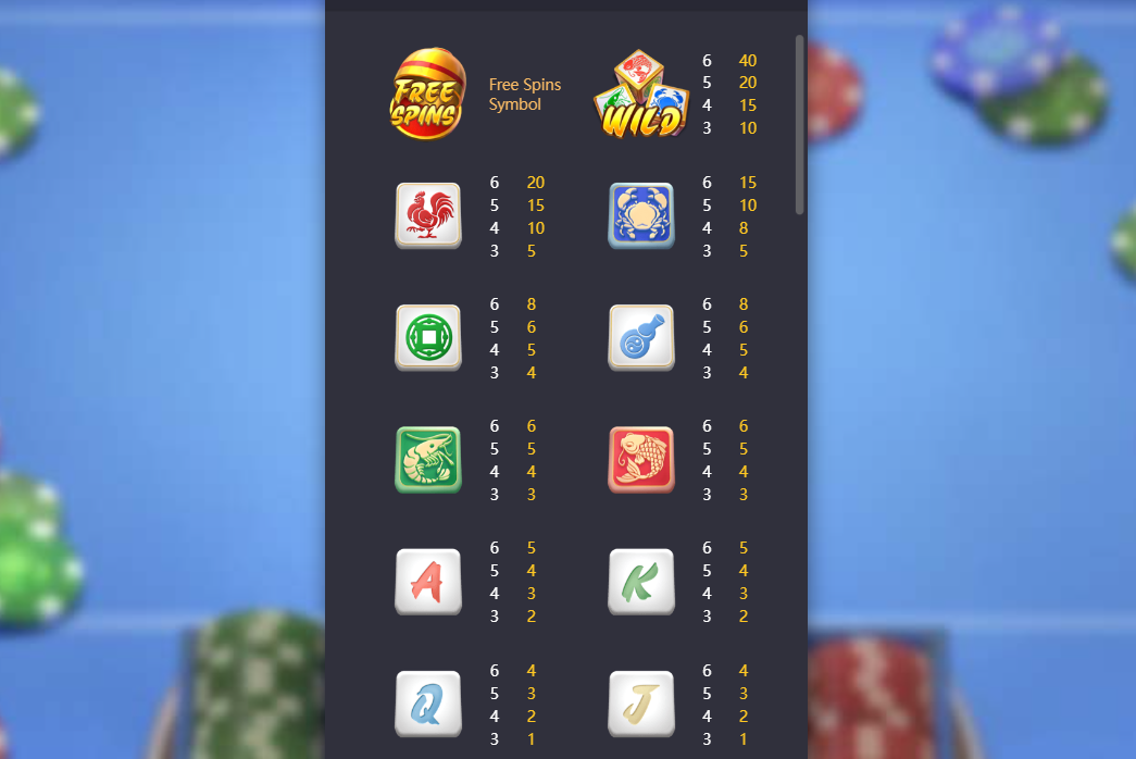 สัญลักษณ์ภายในเกมส์จะมีทั้งหมด 12 สัญลักษณ์ ต้องมีสัญลักษณ์เหมือนกัน 3 ตัว การหมุน 1 ครั้งสามารถชนะได้มากกว่า 1 ไลน์เดิมพัน สัญลักษณ์แต่ละสัญลักษณ์ มีอัตราการจ่ายเงินรางวัลที่แตกต่างกัน ขึ้นอยู่กับการวางเดิมพัน โดยมีอัตราการจ่ายเงินดังนี้ หากเกิดข้อผิดพลาดระหว่างเกม จะถือว่าเป็นโมฆะทั้งหมด