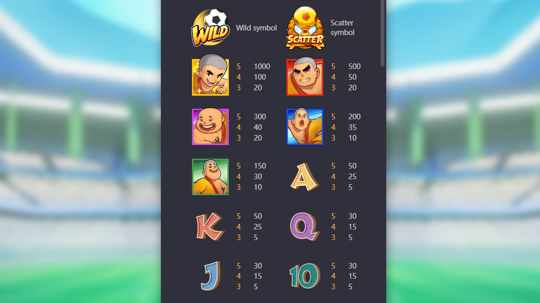 เป็นเกมแบบวิดีโอ 5 รีล 4 แถว ที่มีถ้วยฟุตบอลเป็นตัวแทนสัญลักษณ์ไวด์ และรูปลูกฟุบอลเป็นสัญลักษณ์ของสแคทเตอร์ มีโอกาสได้รับโบนัสสูงสุดถึง 4,000 เท่า “ คุณก็ไม่ต่างไปจากคนไร้ค่าหากคุณไม่มีความฝัน” มาร่วมทีมเส้าหลิน เพื่อสัมผัสกับความฝันของเหล่านักฟุตบอลที่ยิ่งใหญ่กันเลย