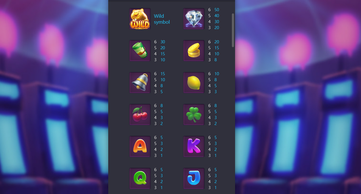 สัญลักษณ์ เพชร มีสัญลักษณ์ เพชร เป็นสัญลักษณ์ที่ได้รางวัลตอบแทนสูงที่สุดของเกม จากสัญลักษณ์ทั้งหมด หากเก็บสัญลักษณ์ได้ตั้งแต่ 3 – 6 สัญลักษณ์ จะได้รับรางวัลตอบแทนตั้งแต่ 20 , 30 , 40 และ 50 เท่า ของยอดเดิมพัน
