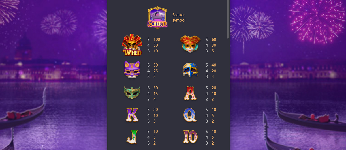 - สัญลักษณ์ หน้ากากหญิงสาว มีสัญลักษณ์ หน้ากากหญิงสาว เป็นสัญลักษณ์ที่ได้รางวัลตอบแทนสูงที่สุดจากสัญลักษณ์ทั้งหมด หากเก็บสัญลักษณ์ได้ตั้งแต่ 3 – 5 สัญลักษณ์ จะได้รับรางวัลตอบแทนตั้งแต่ 10x – 100x เท่า ของยอดเดิมพัน