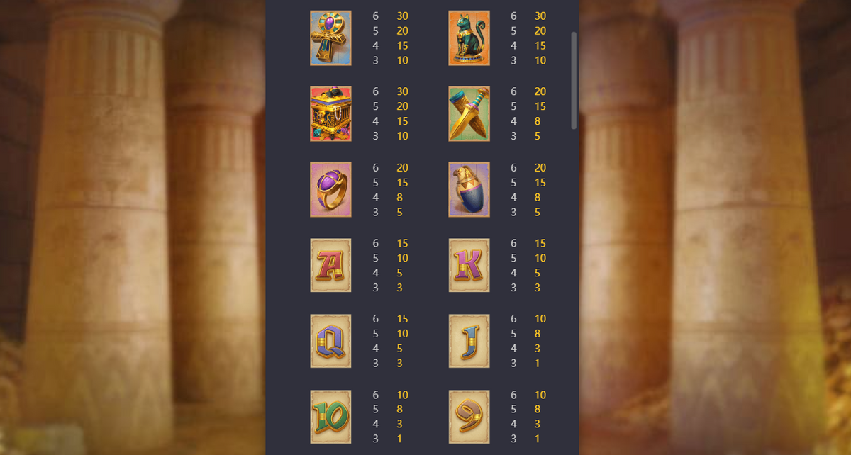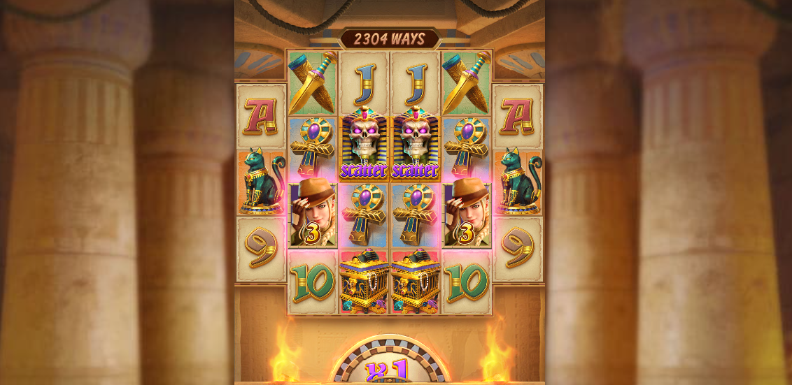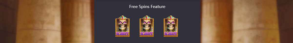 - Scatter Symbol สัญลักษณ์พิเศษ Scatter เป็นรูป หัวกระโหลกฟาโรห์ รวบรวมสัญลักษณ์นี้ 3 สัญลักษณ์ขึ้นไป เพื่อเข้าสู่ฟีเจอร์ฟรีสปิน