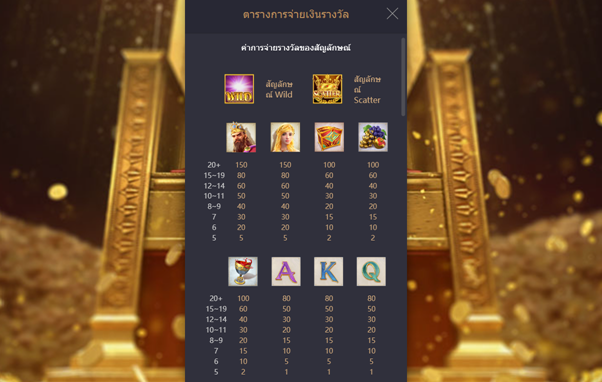 High Paying Symbols มีสัญลักษณ์ ราชินี เป็นสัญลักษณ์ที่ได้รางวัลตอบแทนสูงที่สุด เป็นอันดับที่ 2 จากสัญลักษณ์ทั้งหมด หากเก็บสัญลักษณ์ได้ตั้งแต่ 5 – 20+ สัญลักษณ์ จะได้รับรางวัลตอบแทนตั้งแต่ 5x – 150x เท่า ของยอดเดิมพัน